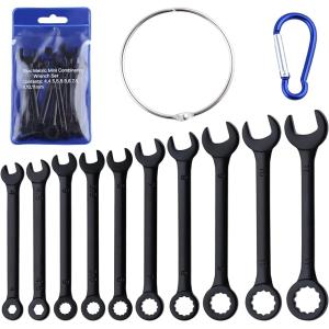 ミニスパナセット 片目片口スパナ コンビセット めがねレンチ ツールロールポーチ付 薄型 締付け (ブラック, 10本組 4-11mm)